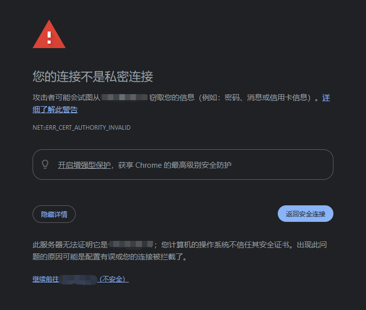 其次自签证书由于是由不受信任的CA签发,因此绝大多数的浏览器也不会信任这些网站,同时还会弹出警告提醒用户甄别。