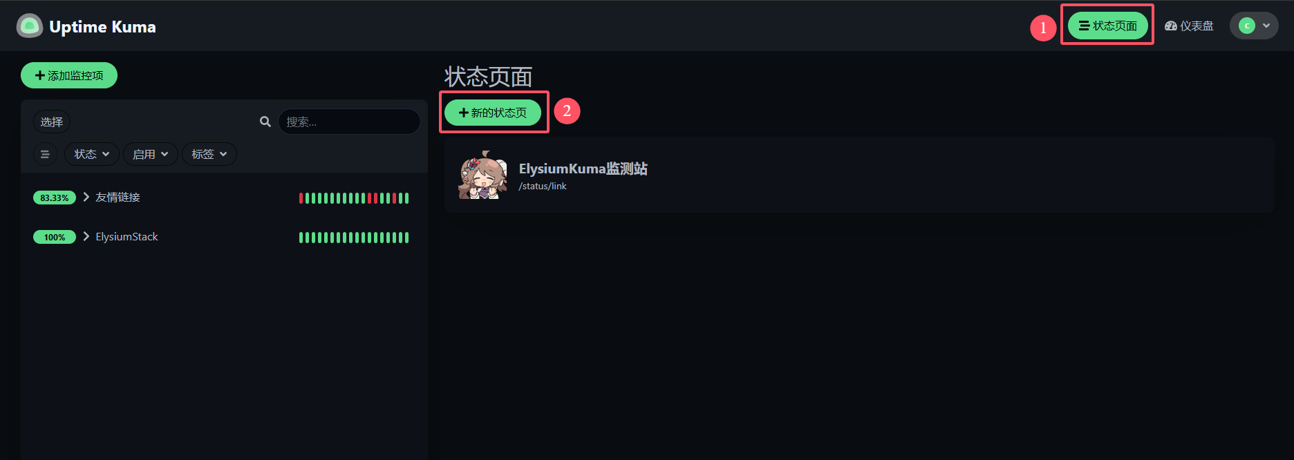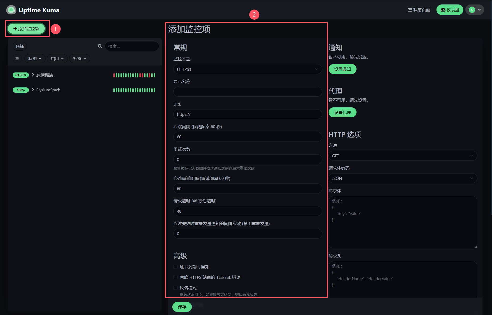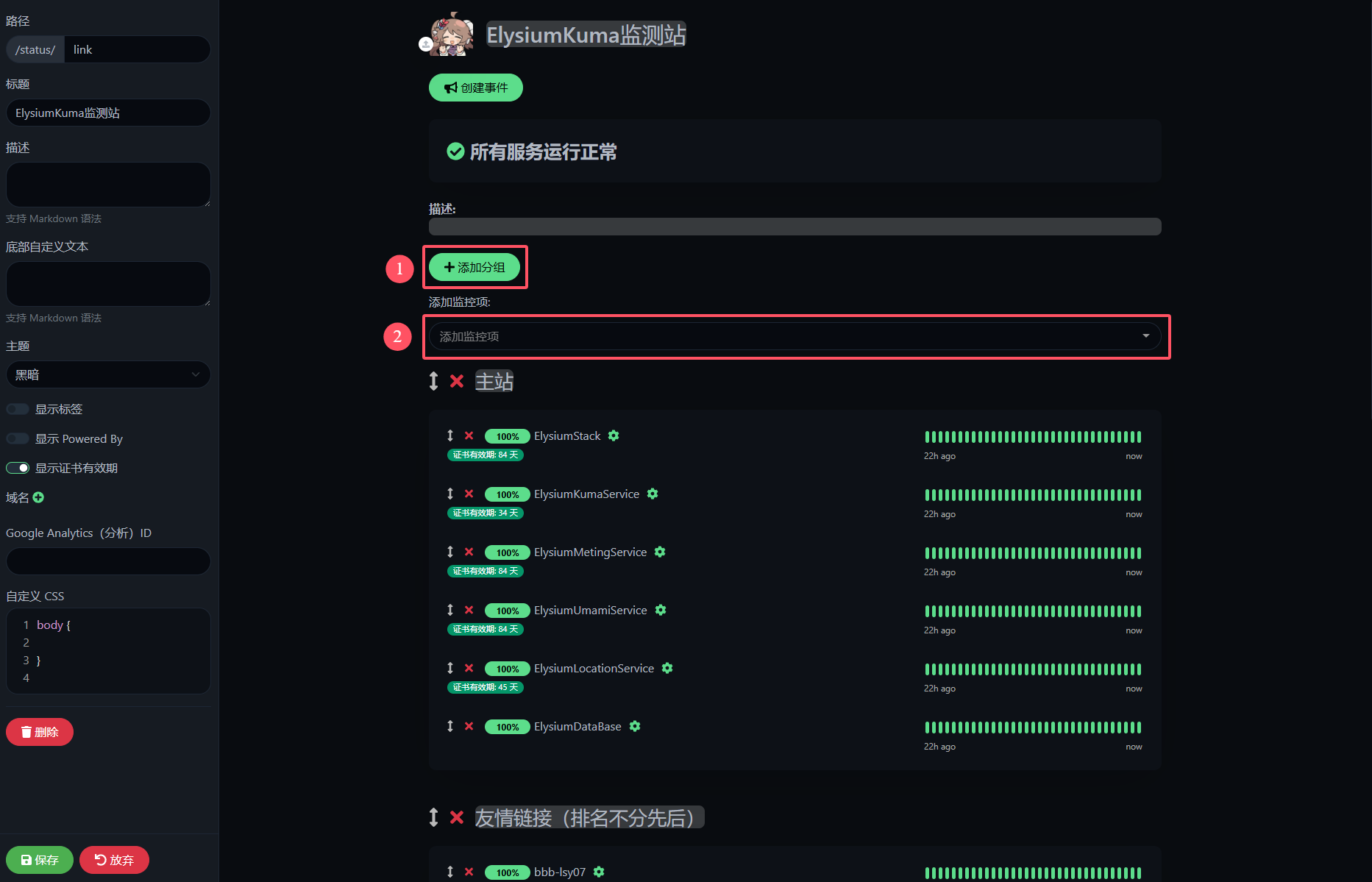 它可以帮助我们定时监控目标域名或中间件服务的运行状态,同时提供SSL证书到期提示的能力。本站的ElysiumKuma监测站便是基于UptimeKuma容器来进行部署的